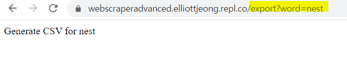 한번의 추출의 결과로 fake DB에 해당 내용이 저장되어 있으므로 export?word=nest 링크가 Exception block으로 가지 않고 제대로 작동