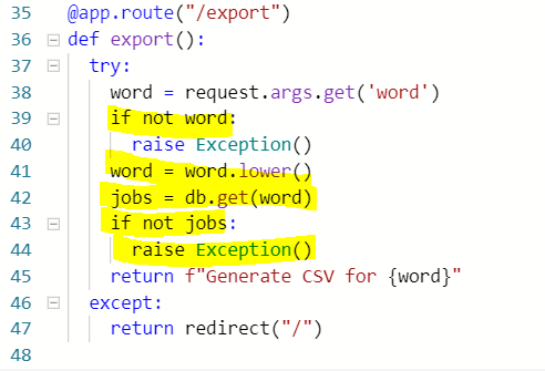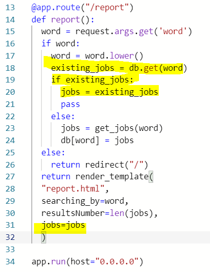 22: 존재하지 않는다면, 즉 새로 입력된 값이라면 jobs = get_jobs(word) function 실행한 후