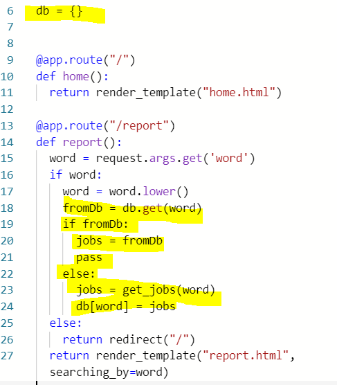 19: 만약 그렇게 입력된 키워드에 대한 value가 frmoDb에 존재한다면, 즉 already 저장된 값이라면 jobs= fromDB를 하고 pass