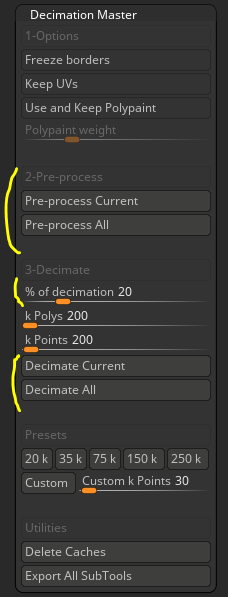 2) 만약 특정 서브툴에 엄청난 디테일을 집어넣어줘서 서브툴마다 각각 다른 decimation 수치를 지정해주고 싶다 하는 경우: Pre-process Current > Decimate Current