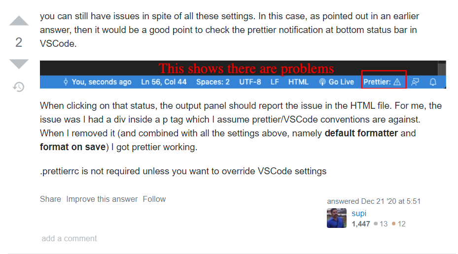 만약 위의 모든 설정을 끝내고도 prettier가 제대로 작동하지 않는다면, 나와 같은 경우를 의심해볼 수 있다. 1, 2번의 솔루션으로 가득한 구글을 뒤지던 중 스택오버플로우에서 이런 답변을 발견했다.
