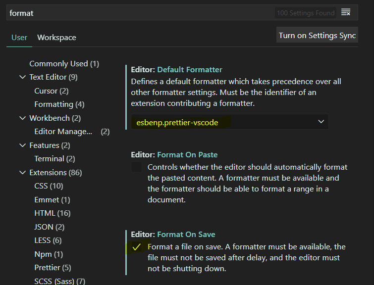 그리고 "FormatOnSave"를 검색해 체크가 되어 있는지 확인하고,