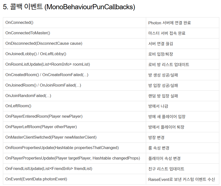 | 접속 감지 | OnClientConnectedCallback | override void OnPlayerEnteredRoom(Player newPlayer) |
