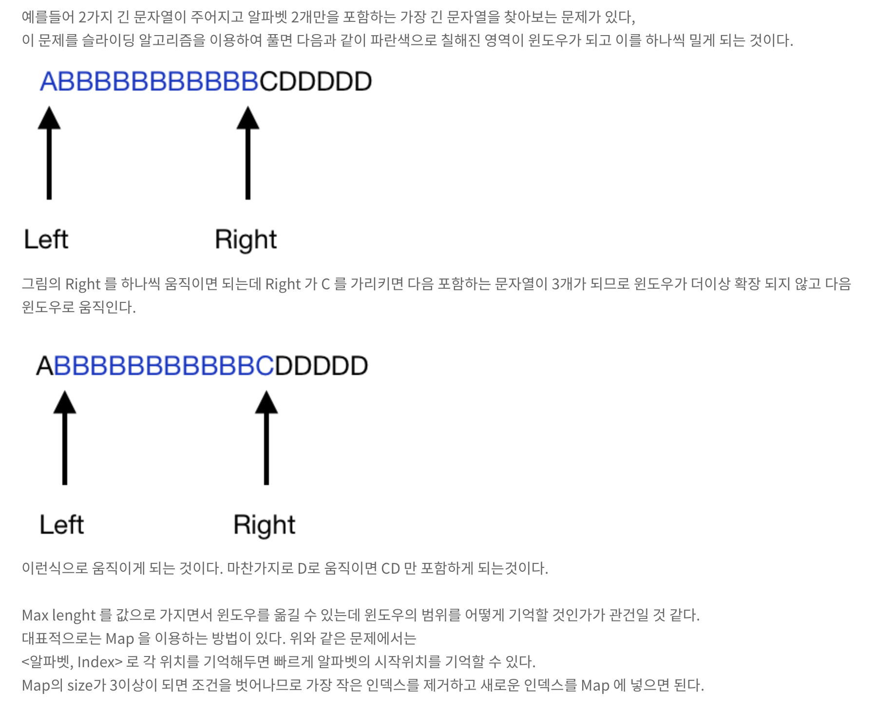 이 문제를 풀 때에는 sliding window라는 알고리즘을 풀면 쉽게 풀 수 있다.