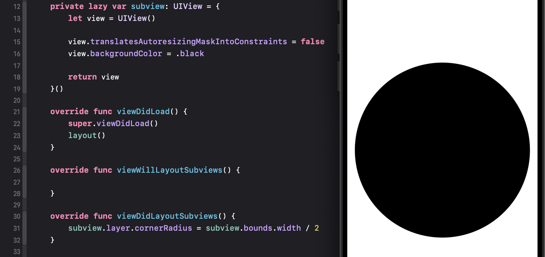 어떤 레이아웃은 뷰 컴포넌트의 크기 값을 이용하여 적용해야 할 때가 있다. 대표적인 예로 cornerRadius가 있는데, 정사각형을 완벽한 원으로 만들려면 이 값을 width 또는 height 값의 절반을 지정해줘야 한다.