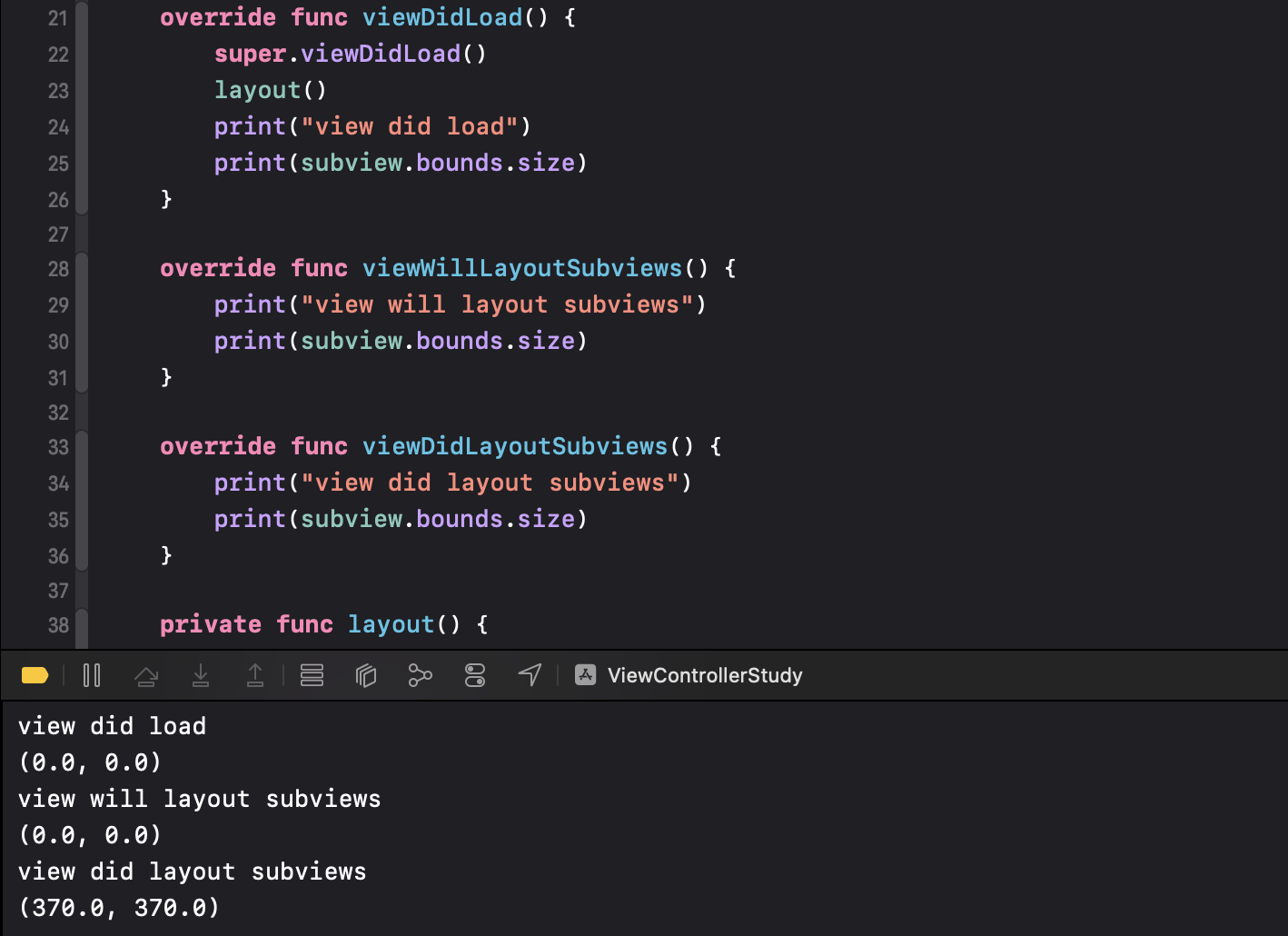 우선 viewDidLoad → viewWillLayoutSubviews → viewDidLayoutSubview 순으로 호출되는 것이 보인다. subview의 크기를 출력해봤을 때, viewWillLayoutSubviews 시점까지 0, 0으로 크기가 안잡혀있고 viewDidLayoutSubviews 시점에 370, 370으로 잡혀있는 것을 확인할 수 있다. (370은 iPhone 16 Pro의 너비에서 32를 뺀 값이다.)