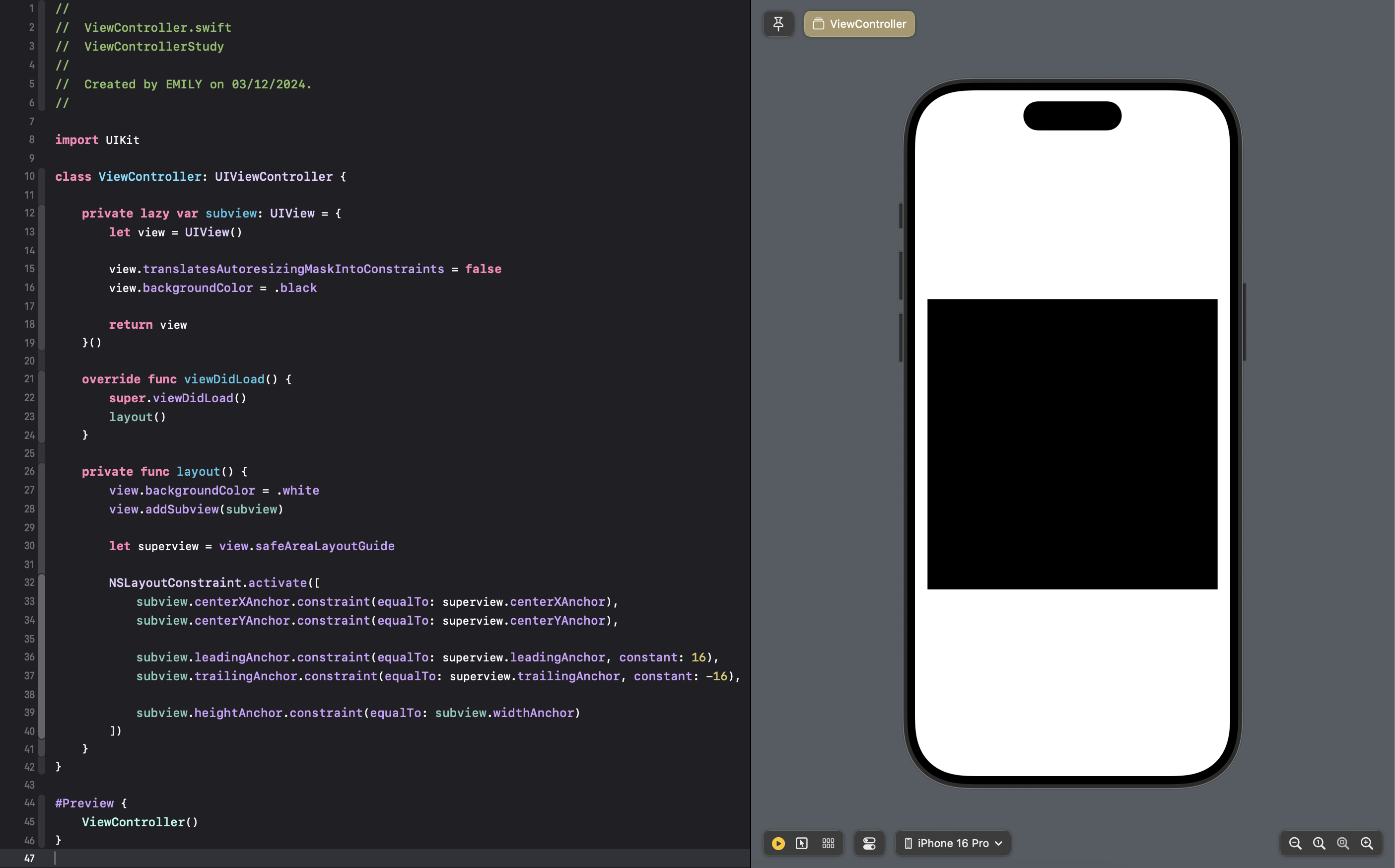 연습용 프로젝트에 그냥 까만 정사각형의 subview 하나를 선언했다. 오토레이아웃 코드를 보면 subview를 화면의 중앙에 배치하고 superview와의 간격을 통해 width를 지정하고, height는 width와 같도록 지정함으로써 직접적인 수치 주입 없이 뷰의 위치와 크기를 정의했다. layout 생명주기를 통해 저 코드들이 적용되는 시점을 확인해보겠다.