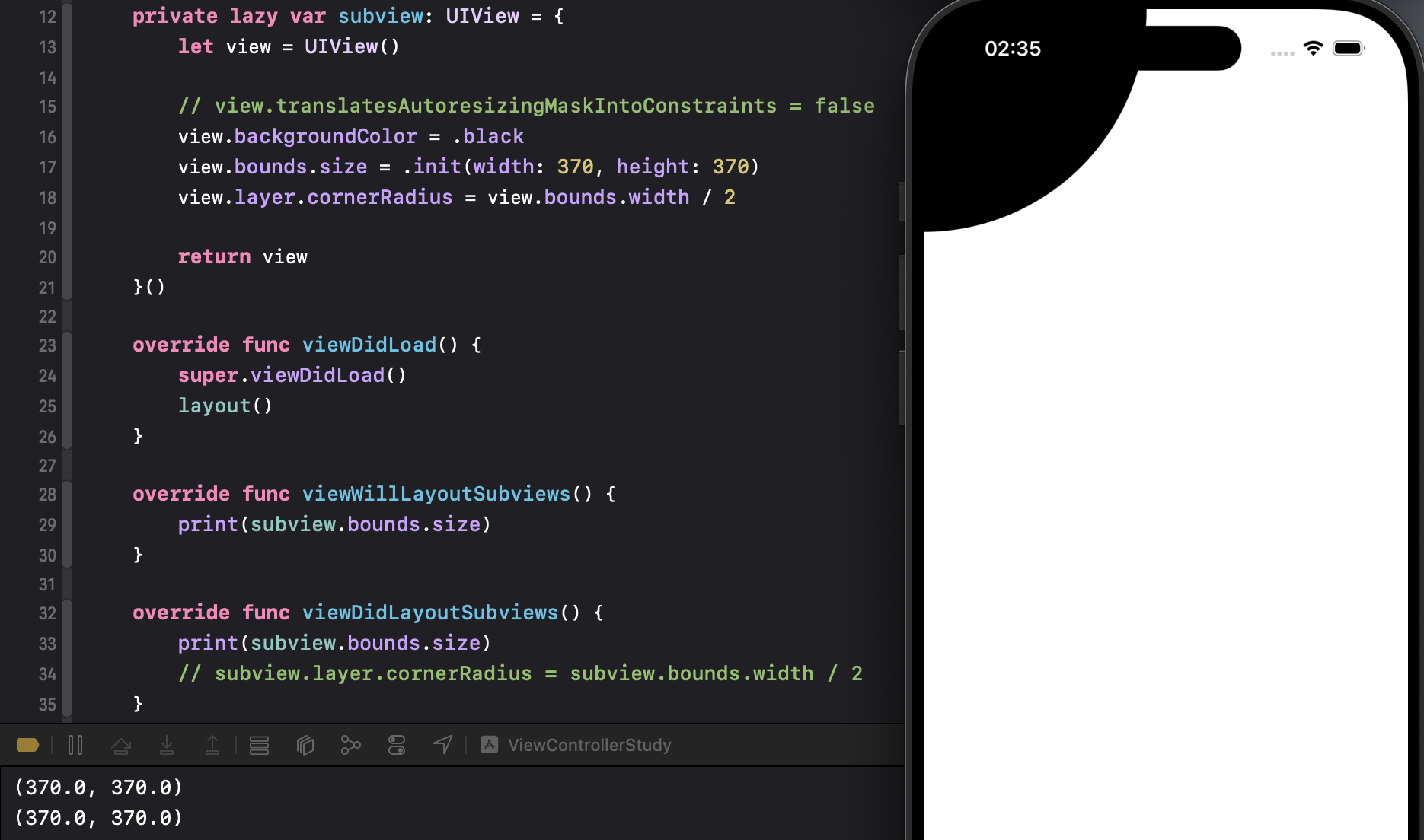 이 코드에서 370 / 2 값을 cornerRadius가 갖게 하려면, bounds.width 값이 370이 되고 나서 할당해줘야 된다는 의미다.