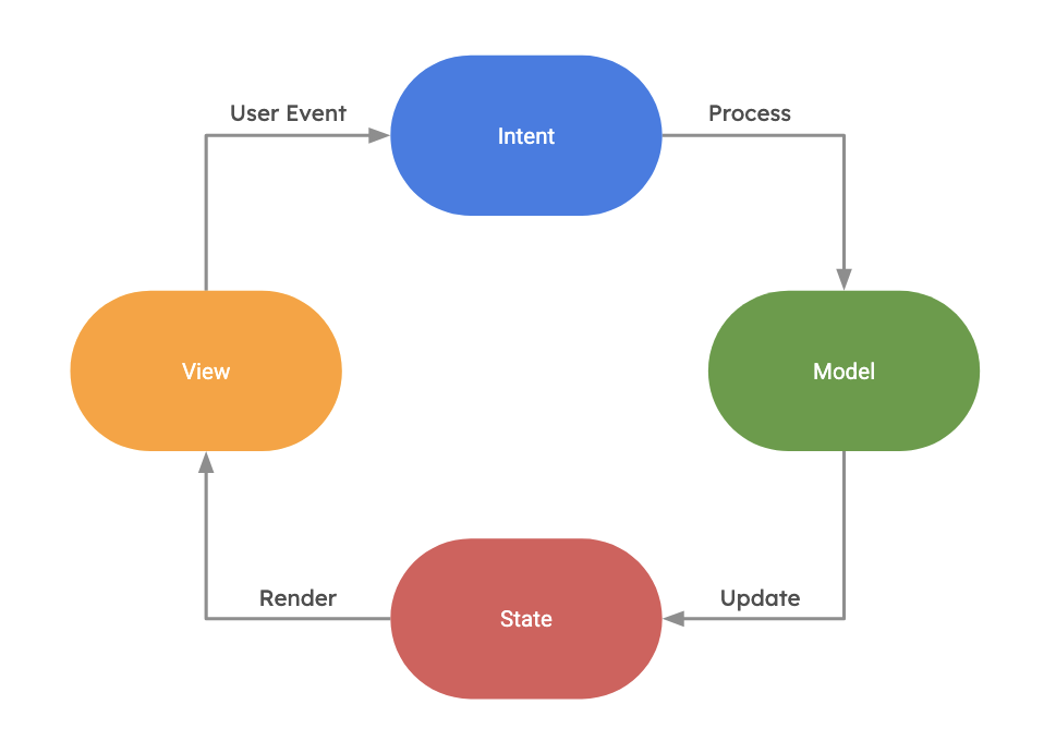 View는 사용자의 상호작용(User Event)을Intent로 변환한다.Intent는 상호작용의 의도에 따라Model이 데이터를 처리(Process)하도록 한다.Model은 처리 결과를 새로운 상태(State)로 갱신(Update)한다.- 갱신된