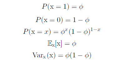 A single binary random variable means that a variable has only two values, 0 and 1. The Bernoulli distribution has a single parameter φ which is the probability of X being equal to 1.