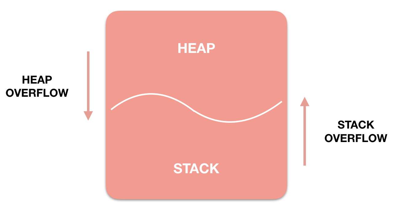 위의 HEAP과 STACK영역은 사실 같은 공간을 공유한다. HEAP이 메모리 위쪽 주소부터 할당되면 STACK은 아래쪽부터 할당되는 식이다. 그래서 각 영역이 상대 공간을 침범하는 일이 발생할 수 있는데 이를 각각 HEAP OVERFLOW, STACK OVERFLOW라고 칭한다.