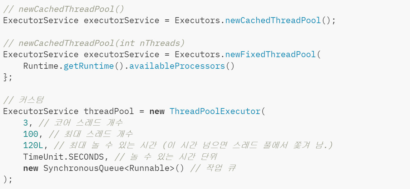 - 초기 스레드 수: ExecutorService 객체가 사용될 때 기본적으로 생성되는 스레드 수