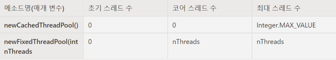 newCachedThreadPool() 메소드는 1개 이상의 스레드가 추가되었을 경우 60초 동안 스레드가 아무 작업하지 않으면 해당 스레드를 풀에서 쫓아내는데, newFixedThreadPool(int nThreads) 메소드는 스레드가 놀고 있어도 제재를 가하지 않는다.