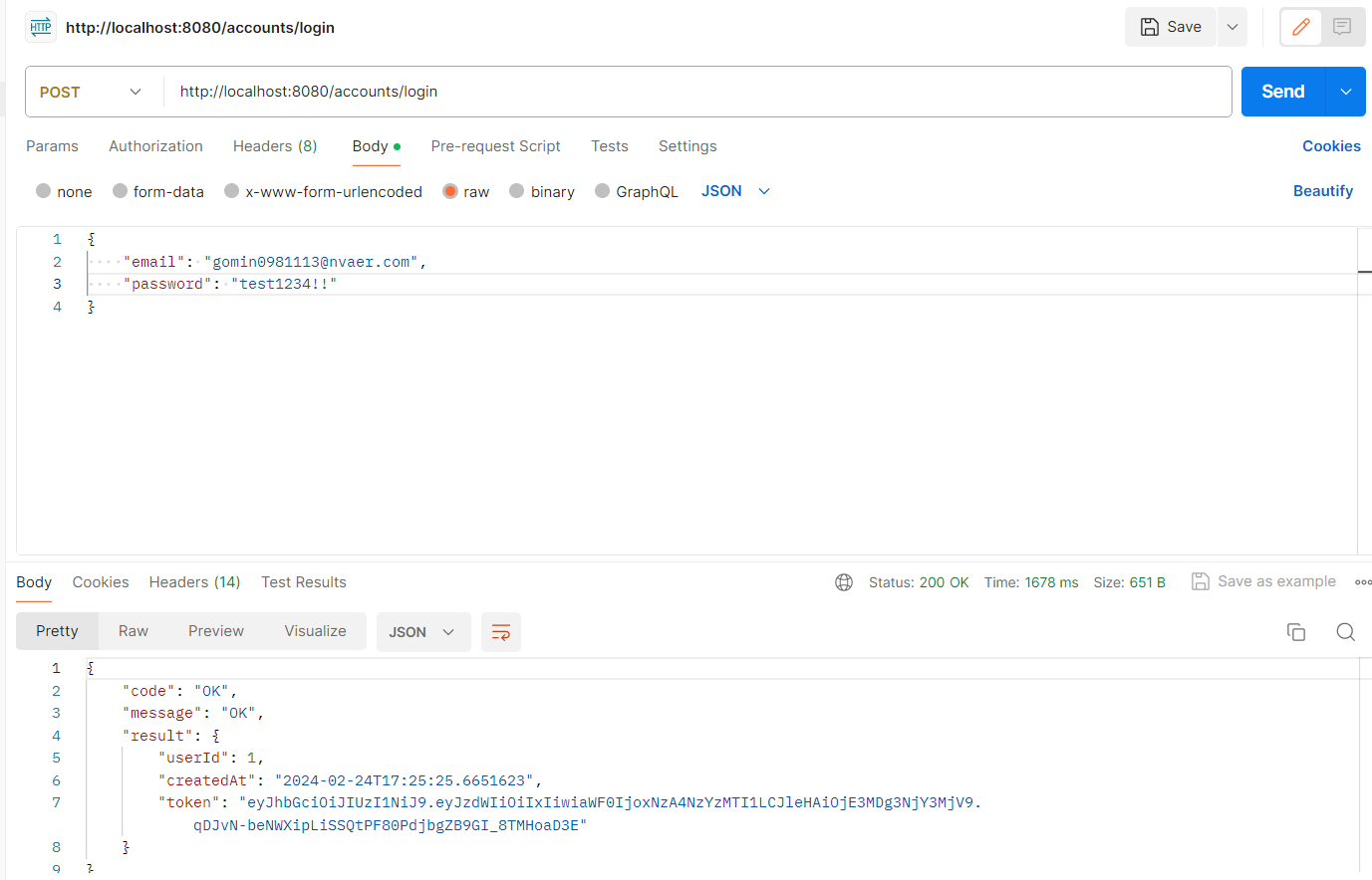 회원을 가입하고, 로그인하고 로그인 시 토큰이 발급되는것을 확일할 수 있다.