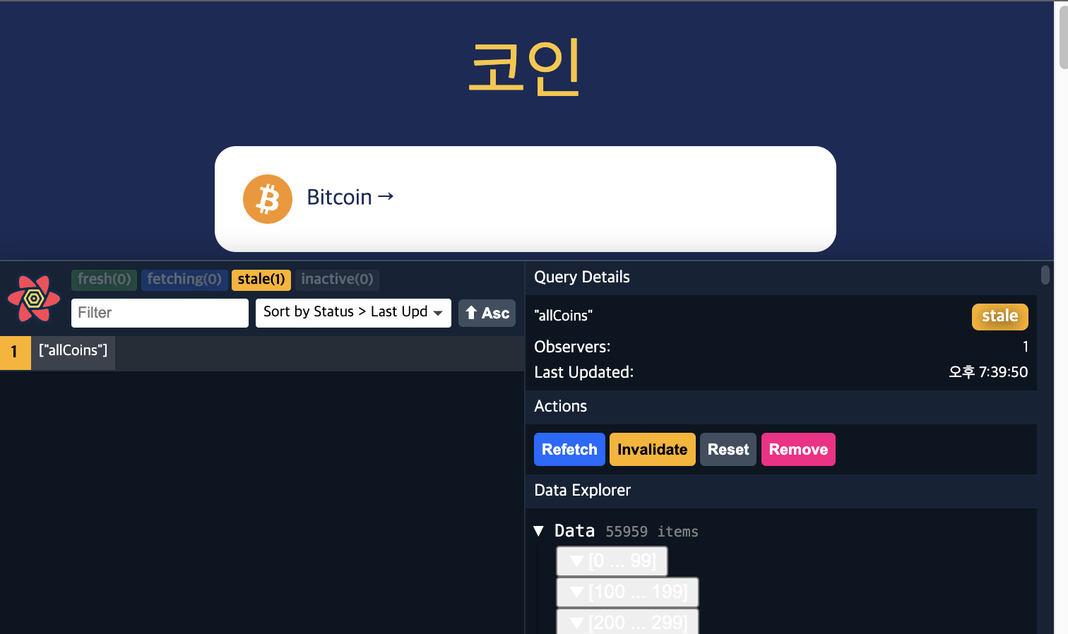 물론 fetchCoins가 있는 api.ts 파일을 만들긴 했으나, 그래도 훨씬 간단하게 api를 불러올 수 있는 것이다.