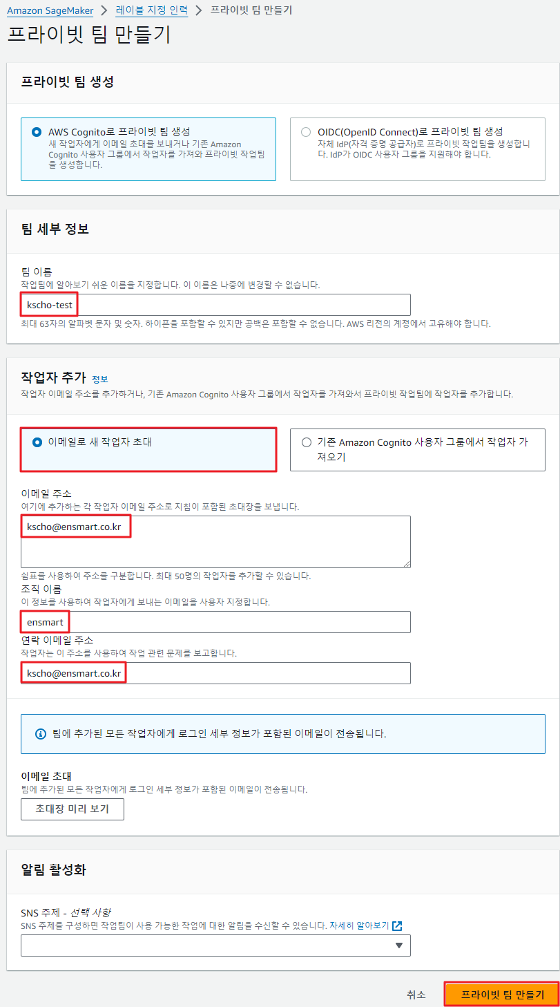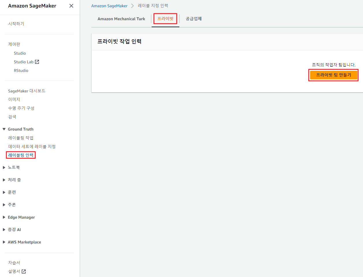 a. SageMaker 콘솔에서 Ground Truth 선택 후 레이블링 인력 지정