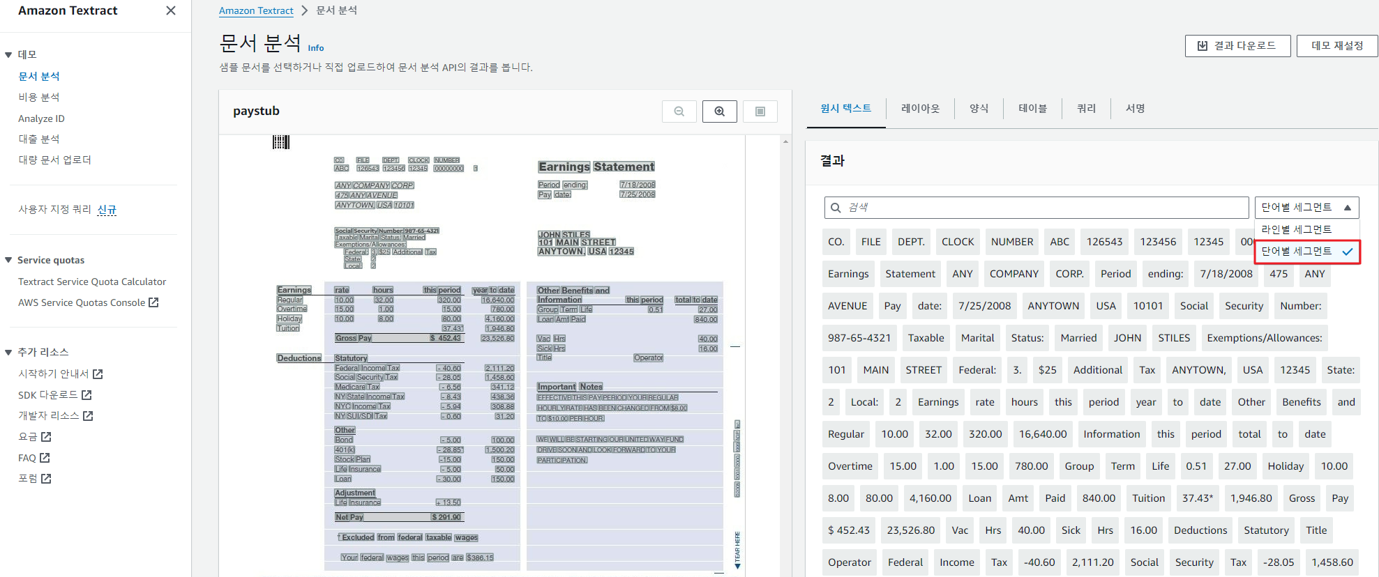 a. 문서 분석 화면에서 '원시 텍스트' 선택하여 내장된 샘플 문서에서 원시 텍스트(OCR) 출력을 추출