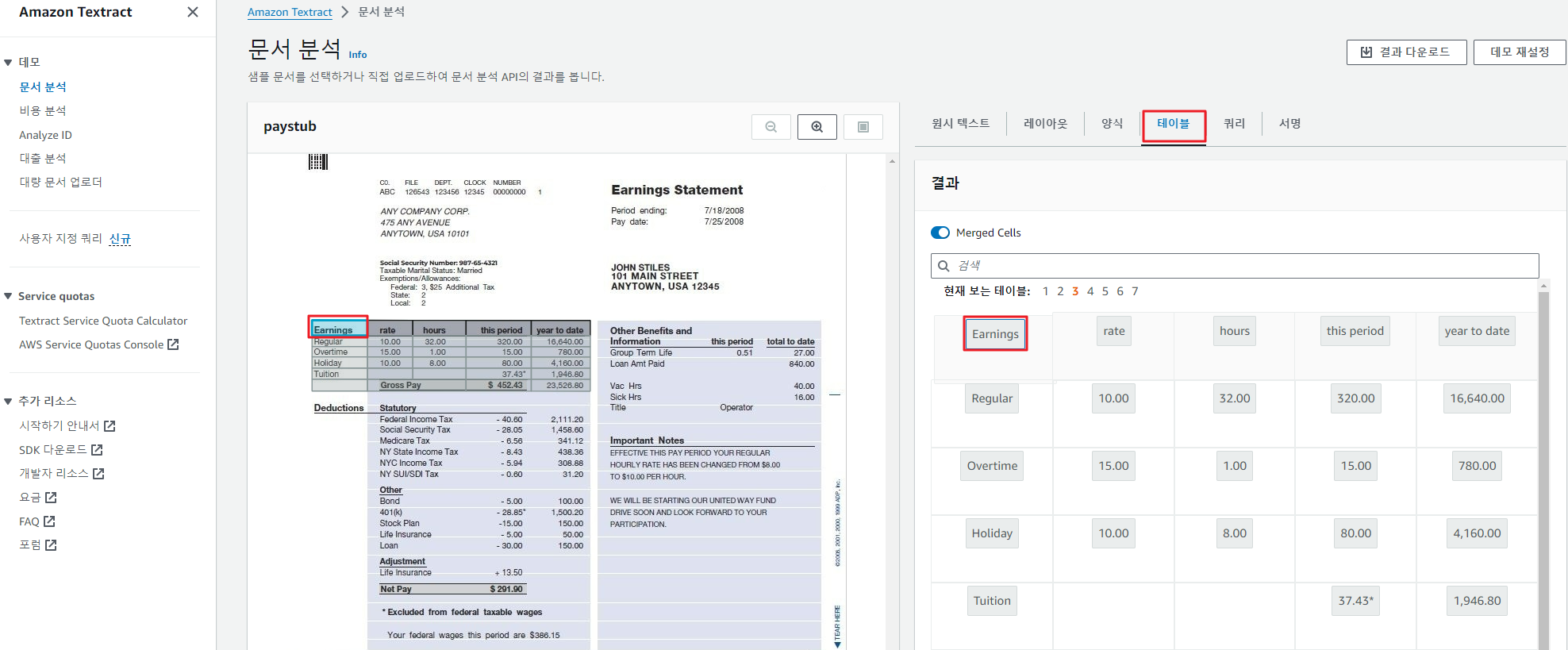 a. 문서 분석 화면의 오른쪽 창에서 테이블을 선택하여 샘플 문서에서 테이블 출력을 추출