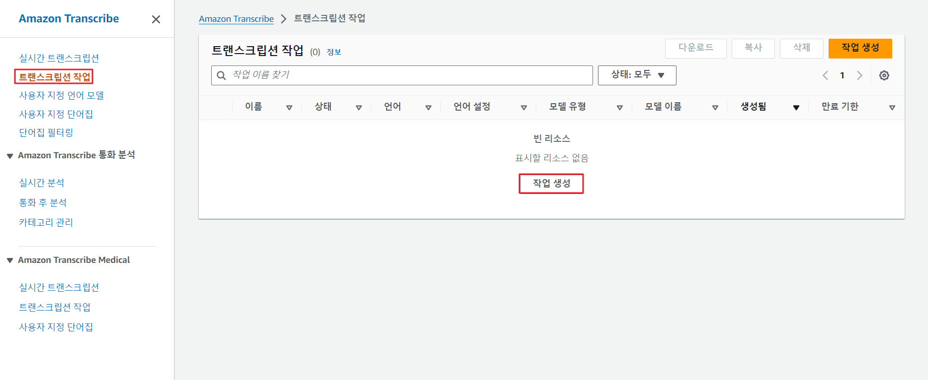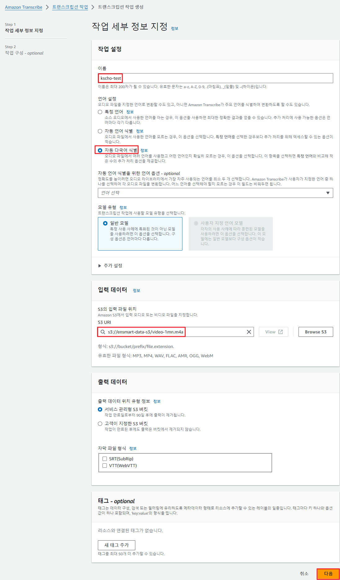 2단계> Amazon Transcribe 작업 생성 및 시작
