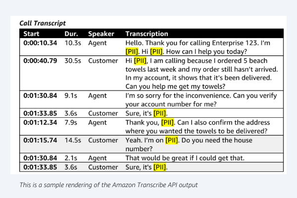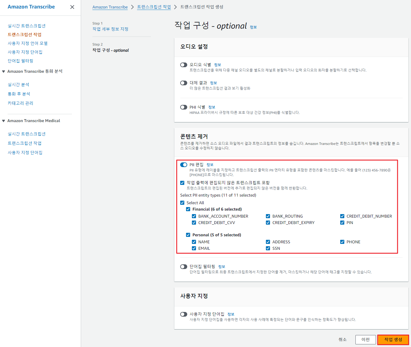 이 단계에서는 Amazon Transcribe 콘솔에서 트랜스크립션 작업을 생성합니다. Amazon Transcribe의 자동 콘텐츠 수정 기능은 트랜스크립션 결과에서 민감한 개인 식별 정보(PII)를 자동으로 수정합니다. 이는 식별된 각 PII 인스턴스를 기록의 [PII] 태그로 대체합니다.