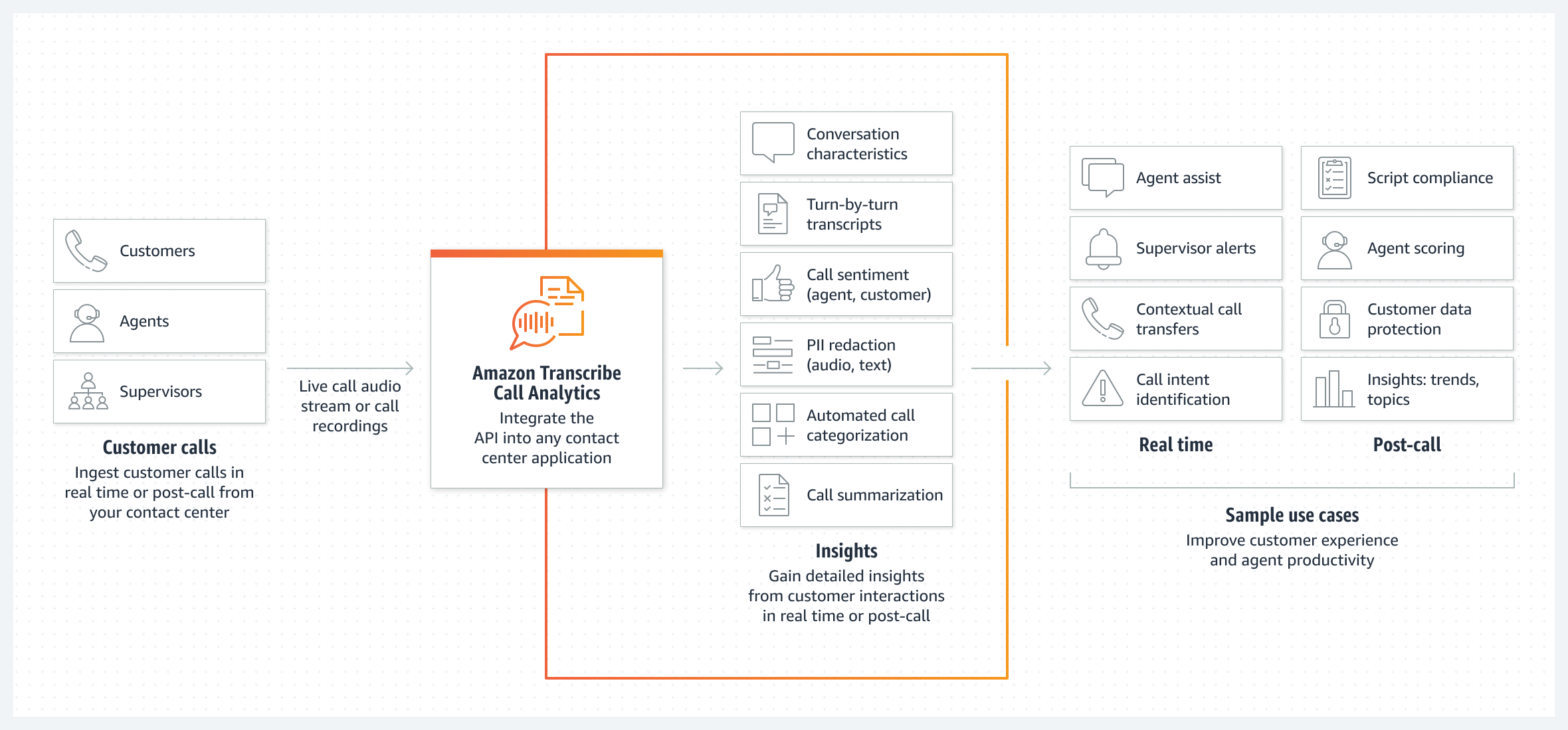 콜 센터에서 고객 대화의 감정, 추세 및 정책 준수 여부를 파악하여 고객 경험을 개선하고 중요한 피드백을 찾아낼 수 있도록 하는 기계 학습(ML) 기반 분석 기능을 제공합니다. API 직접 호출 한 번으로 고객 대화에서 내용, 풍부한 인사이트 및 요약 데이터를 추출할 수 있습니다.