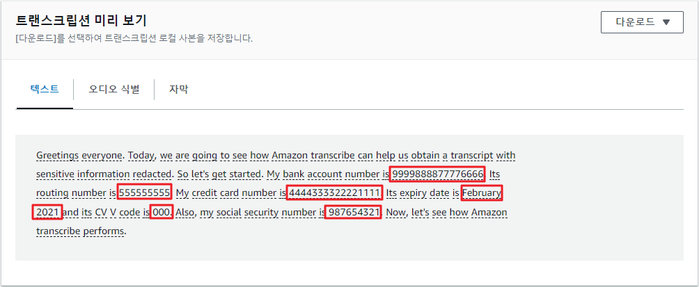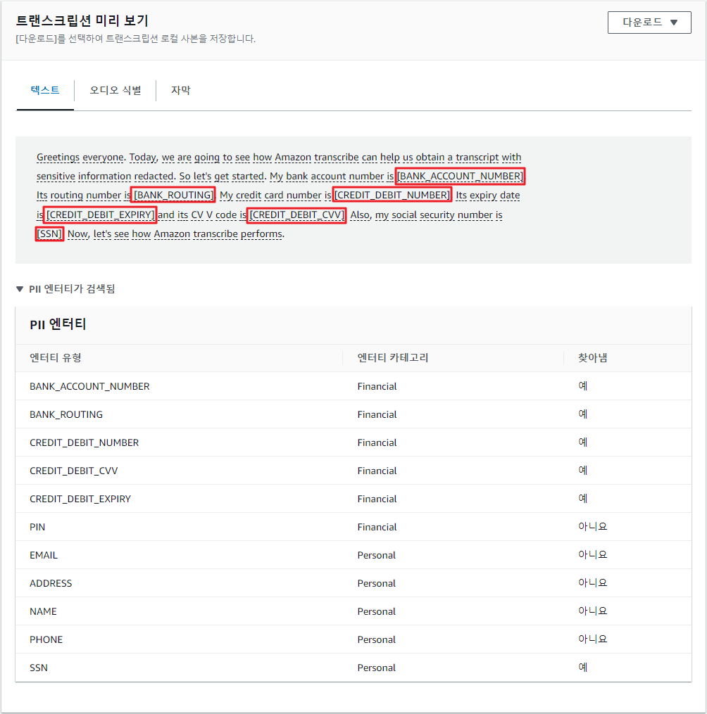 작업 세부 정보 페이지의 트랜스크립션 미리 보기 섹션에서 Amazon Transcribe가 트랜스크립트의 모든 개인 식별 정보(PII)를 [PII]로 대체한 것을 확인할 수 있습니다.