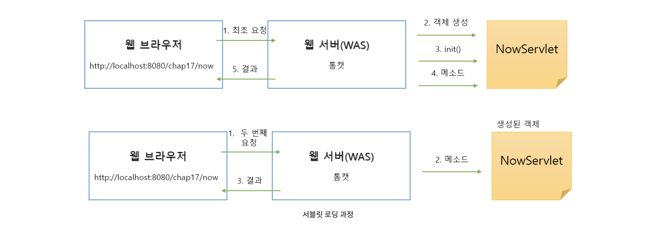 즉 서블릿 컨테이너는 처음 서블릿을 실행할 때 한 번 서블릿 객체를 생성하고(Init메서드),