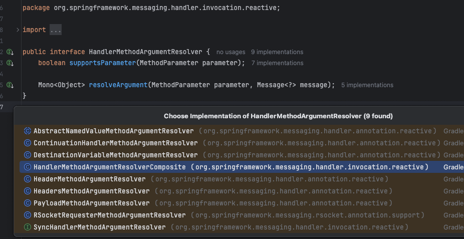 HandlerMethodArgumentResolver의 모습은 위와 같고, HandlerAdapter와 같이 인터페이스를 구현하는 여러 구현체의 형식으로 구성되어있다.