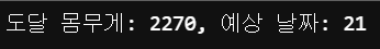 print('도달 몸무게: {}, 예상 날짜: {}'.format(weight, date))