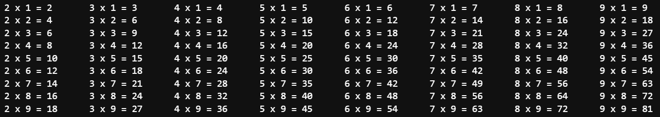 print('{} x {} = {}\t'.format(j, i, result), end='')