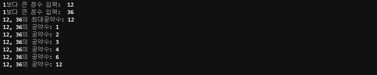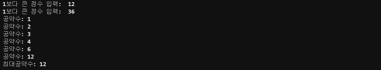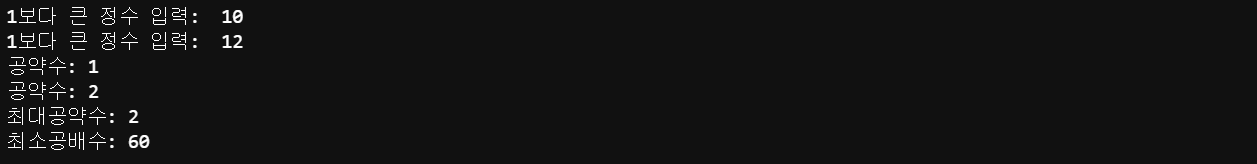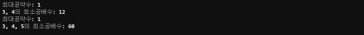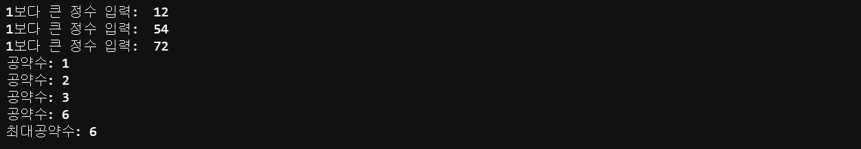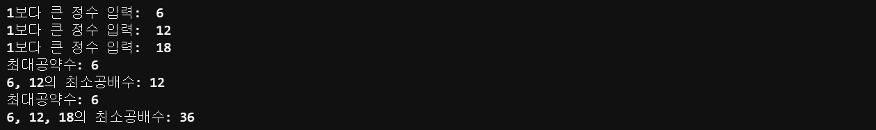 print('최대공약수: {}'.format(maxNum)) # (num1, num2의 최소공배수)와 (num3)의 최대공약수