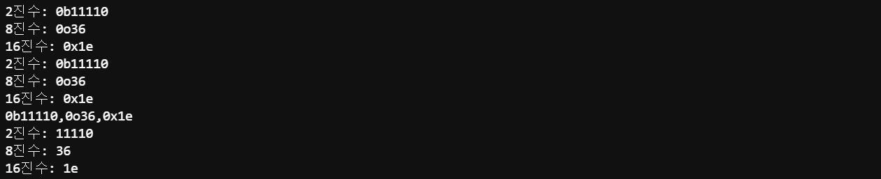2진수로 변경: bin() 사용 # 각 함수 안에는 문자열(0b11110, 0p36 등 입력)