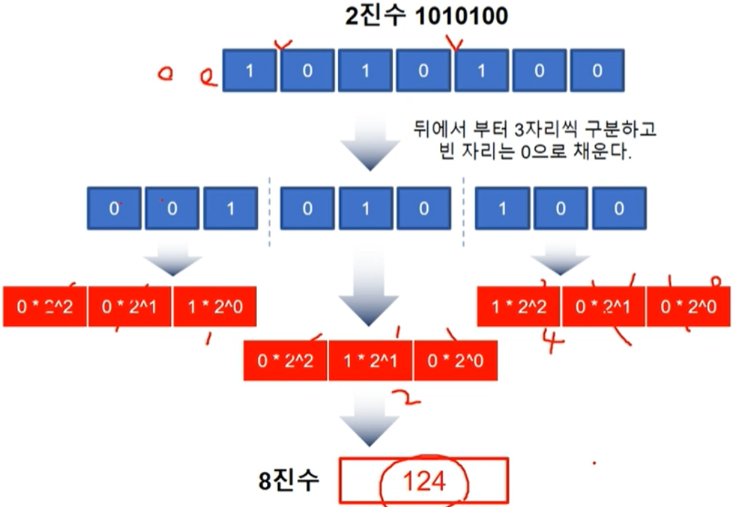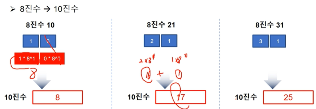 8진법 --> 0 1 2 3 4 5 6 7 (8개 사용)