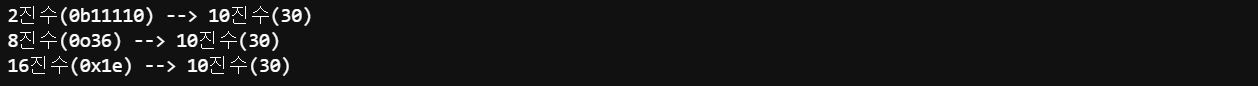 print('2진수(0b11110) --> 10진수({})'.format(int('0b11110', 2))) # 이렇게 int()함수에다 문자열과 진수를 입력해 주면 int내부적으로 진수를 변환해서 출력;