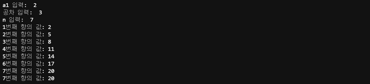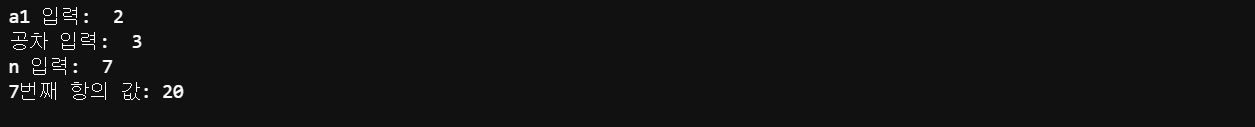 inputN1 = int(input('a1 입력: ')) # 첫번째항 입력