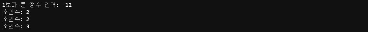 # 6을 다시 2로 나누면 3으로 나누어떨어지니 이 2도 소인수('소인수 2' 출력; 소인수 2 2개),