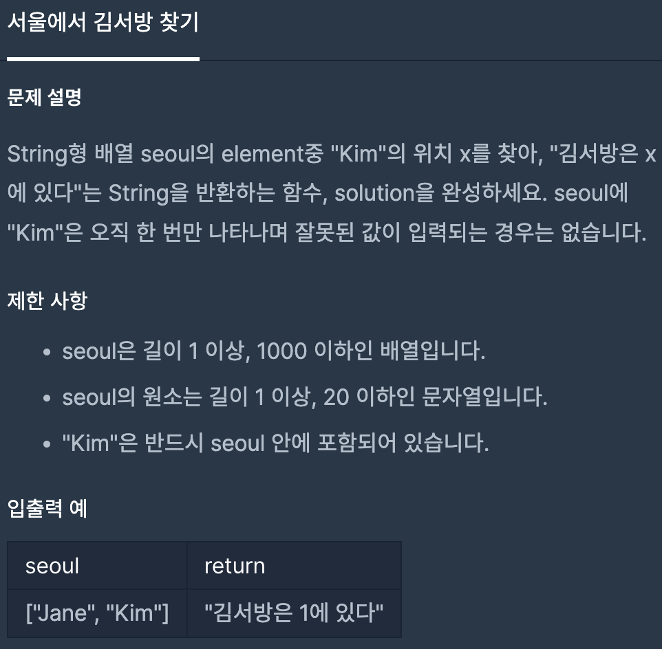 먼저 결과값을 담을 answer 와 x의값을 담을 변수를 선언해주어서 서울의길이만큼 반복문으로 돌려서 만약 반복문안에있는 KIM을 찾으면 반복실행된 수(i)를 x에 넣어주어서 김서방의 위치(김의 인덱스위치값)를 알게해준다