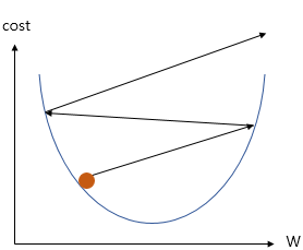 위 그림은 과도하게 step size 의 크기를 크게 했을때에 상황을 나타내고 있습니다.