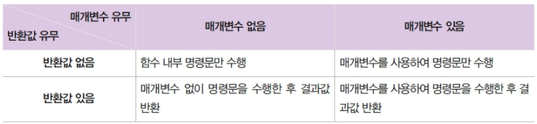 매개변수와 반환값의 유무에 따라 함수를 형태로 구분합니다.
