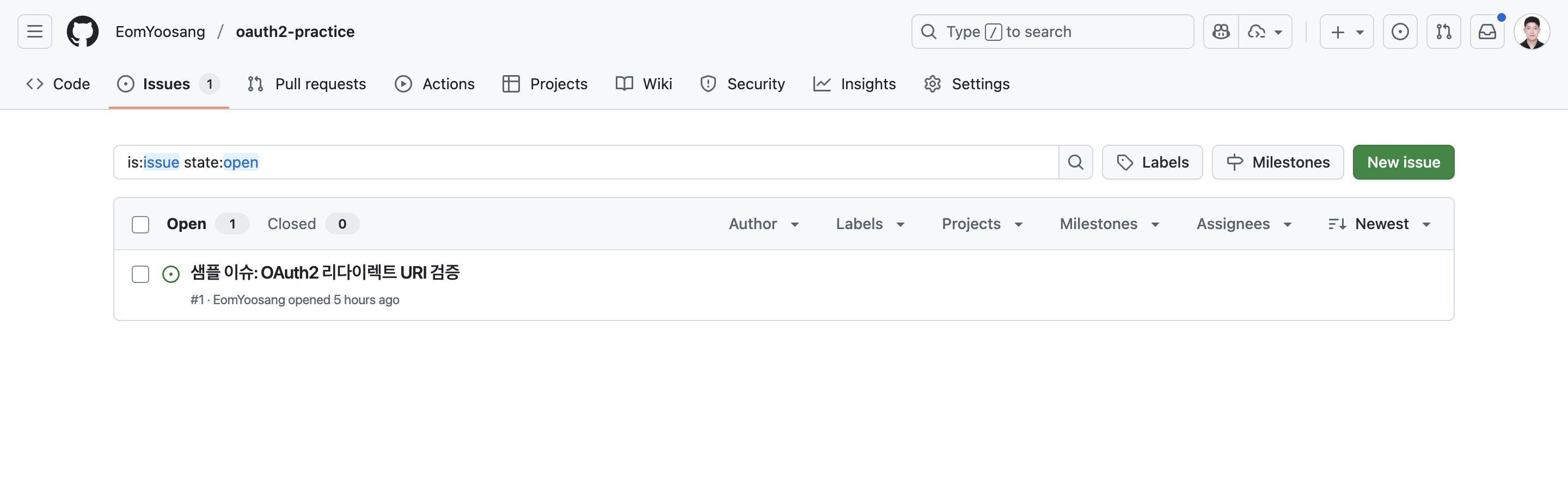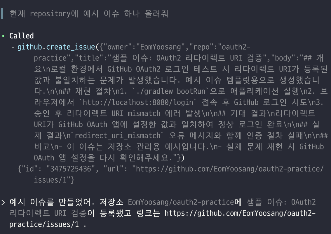 간단하게 이슈를 올려달라고 프롬프팅하면 적용된 모습을 볼 수 있다.