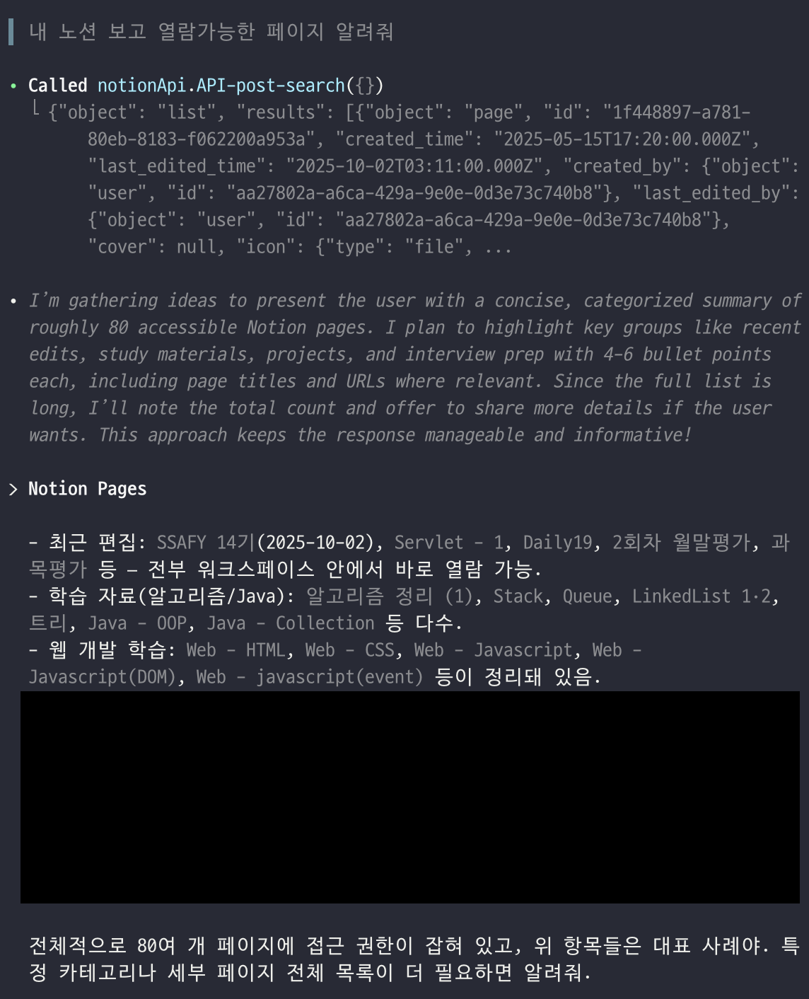 노션을 조회하도록 프롬프팅하여 연결 테스트를 한다.