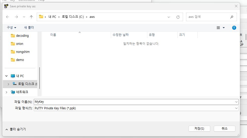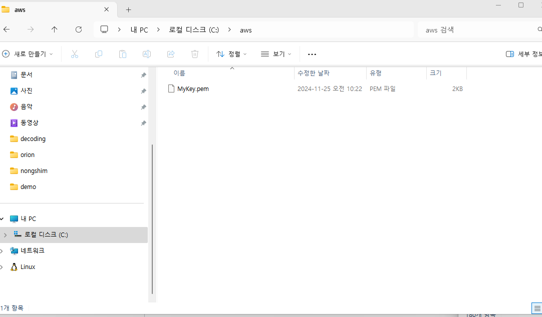 👉 키페어 생성하면 생성된 다운로드 파일을 aws 폴더 내부에 넣어놓자