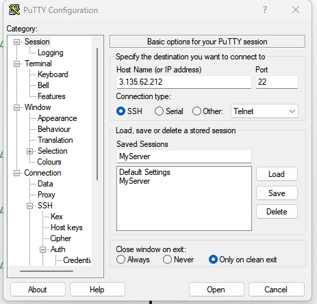 👉 session에서 ipv4 주소를 넣어주고, My Server라는 이름으로 save해놓으면 쁘띠를 꺼도 server의 정보가 저장되어있음.