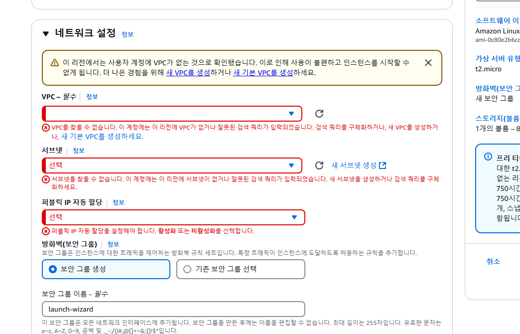 👉 새 기본 vpc생성 하고, 다시 리로드하면 네트워크 설정이 새로 생성된 vpc로 등록이 됨.