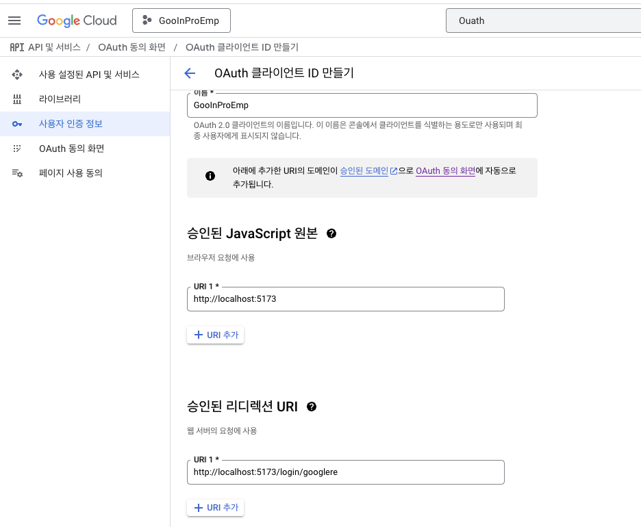 - 사용자 인증정보에서, 사용자 인증 정보 만들기 선택 -> oauth 클라이언트 id -> 웹 애플리케이션 선택