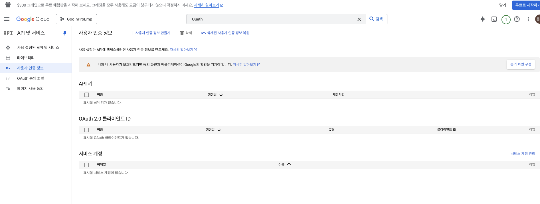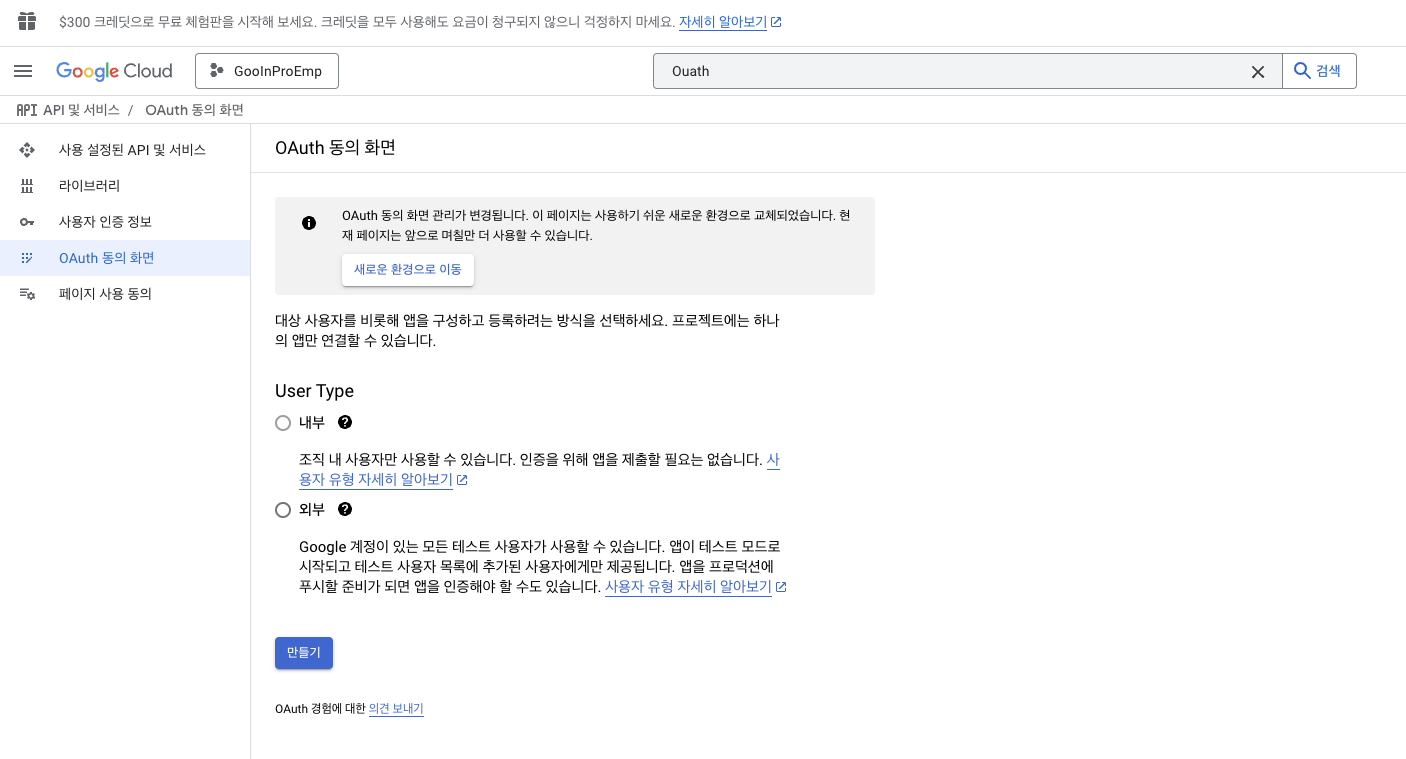 - 검색창에 Oauth검색하여 Oauth동의화면 선택, 외부선택후 만들기