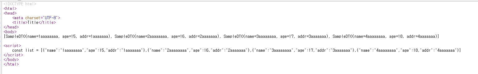 👉 th:inline을 이용하여 list의 배열값을 Ajax사용하지 않고 json 코드와 같은 형식을 만들수있다.