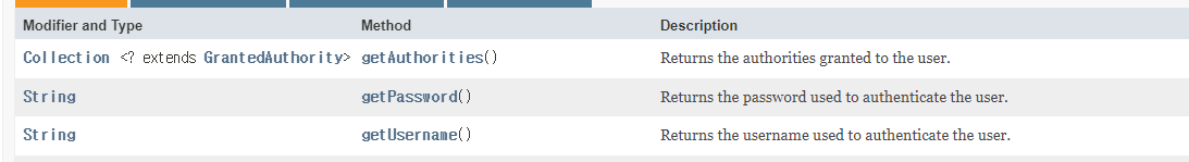 ๐ ํด๋น ํด๋์ค๋ UserDetailsService๋ฅผ ์ธํฐํ์ด์คํ๊ณ ์์ผ๋ฏ๋ก ๊ด๋ จ ์ถ์๋ฉ์๋๋ฅผ ์์ํ๋๋ฐ, UserDetails ์ ๋ฐ์ดํฐํ์ ์ผ๋ก๋ ๊ฐ์ฒด๋ฅผ builder๋ก ์์ฑํ์ฌ username, password, authorities๋ฅผ ๊ตฌ์กฐํํ๋ค.