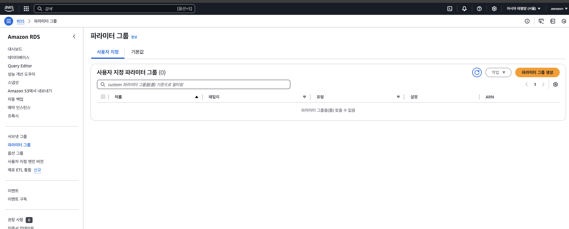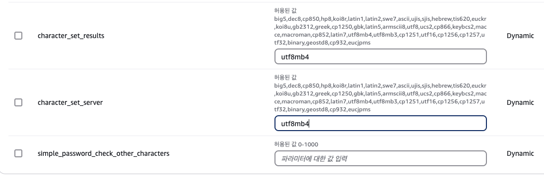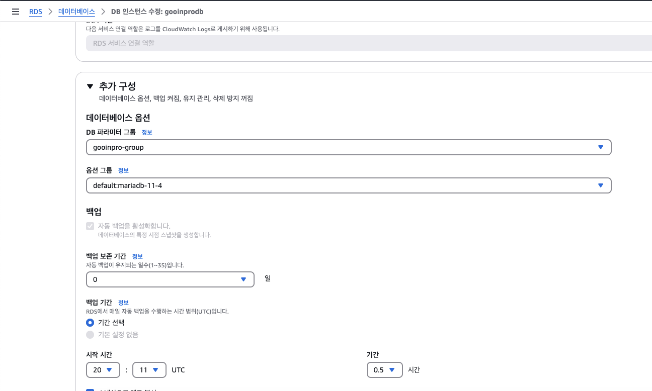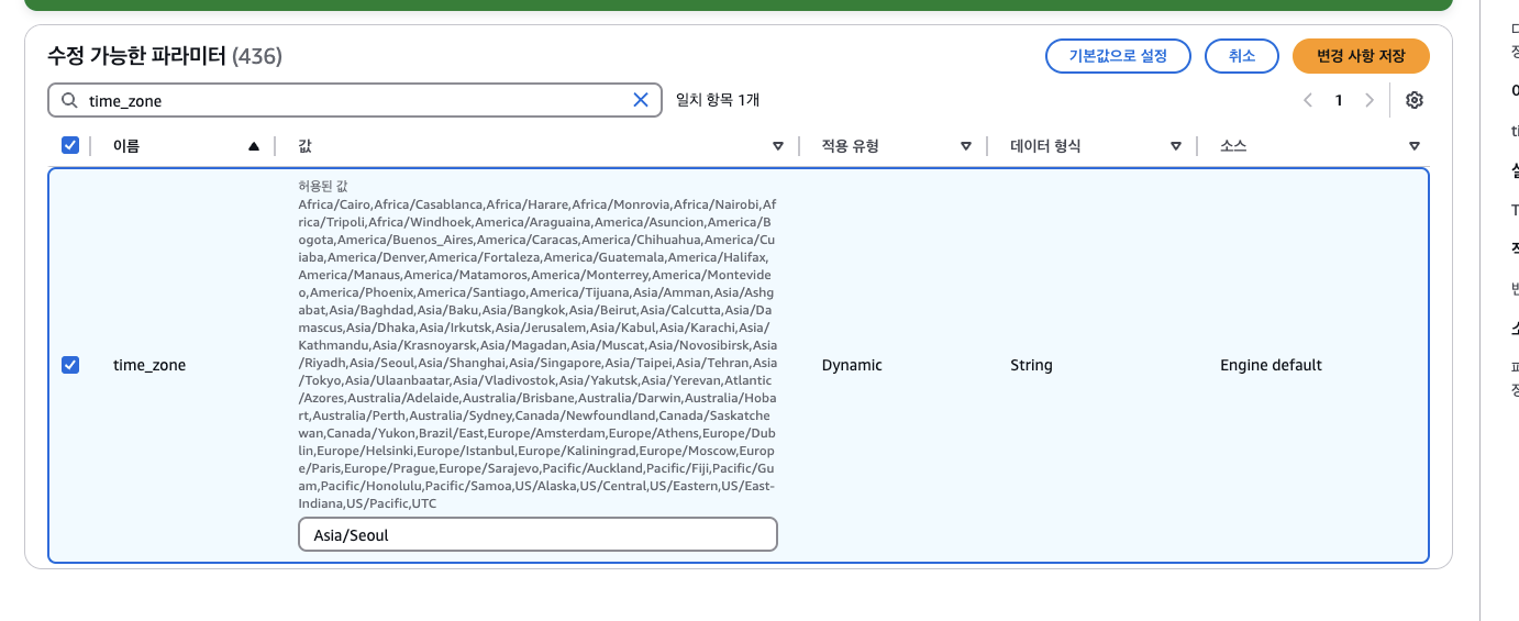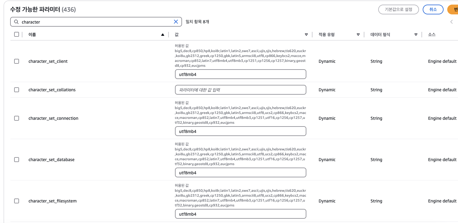 완료후에 rds 수정들어가서 파라미터 그룹 수정 필수.