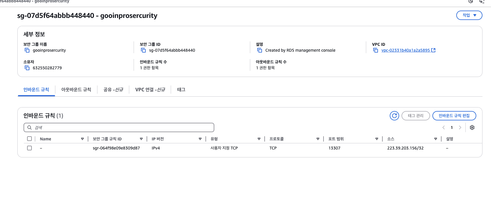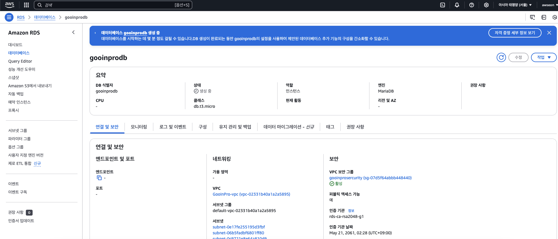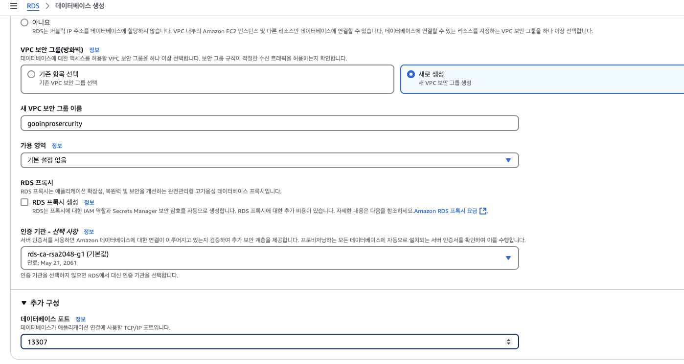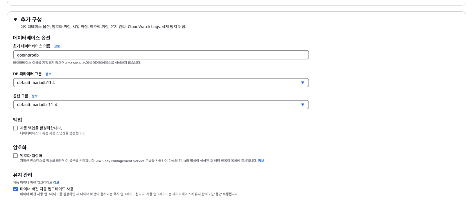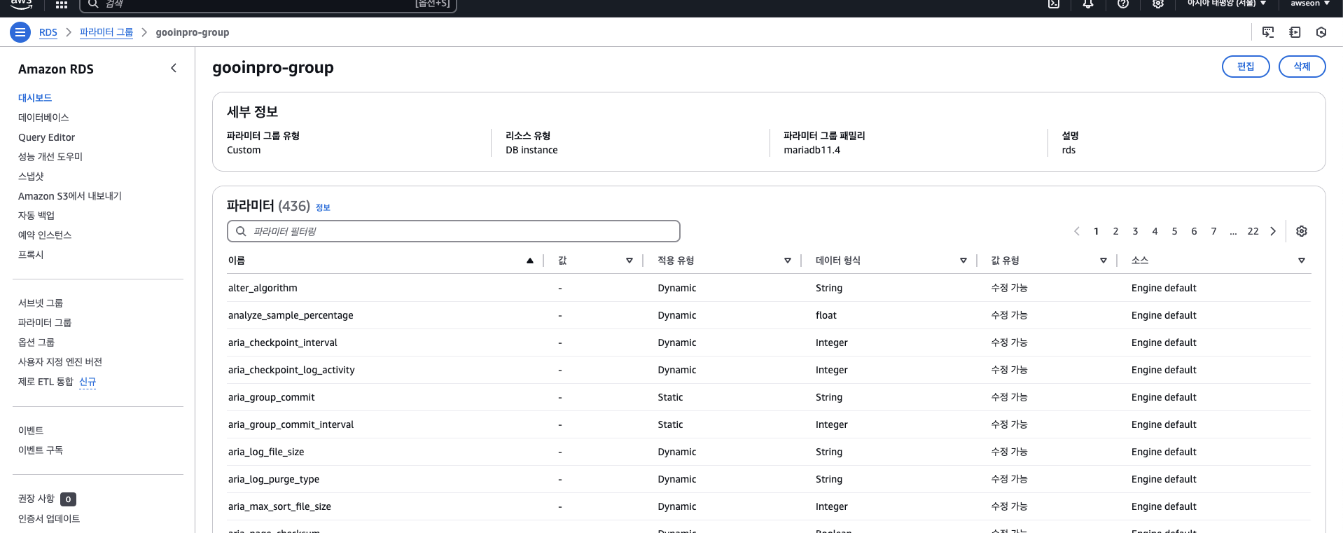 완료후에 rds 수정들어가서 파라미터 그룹 수정 필수.